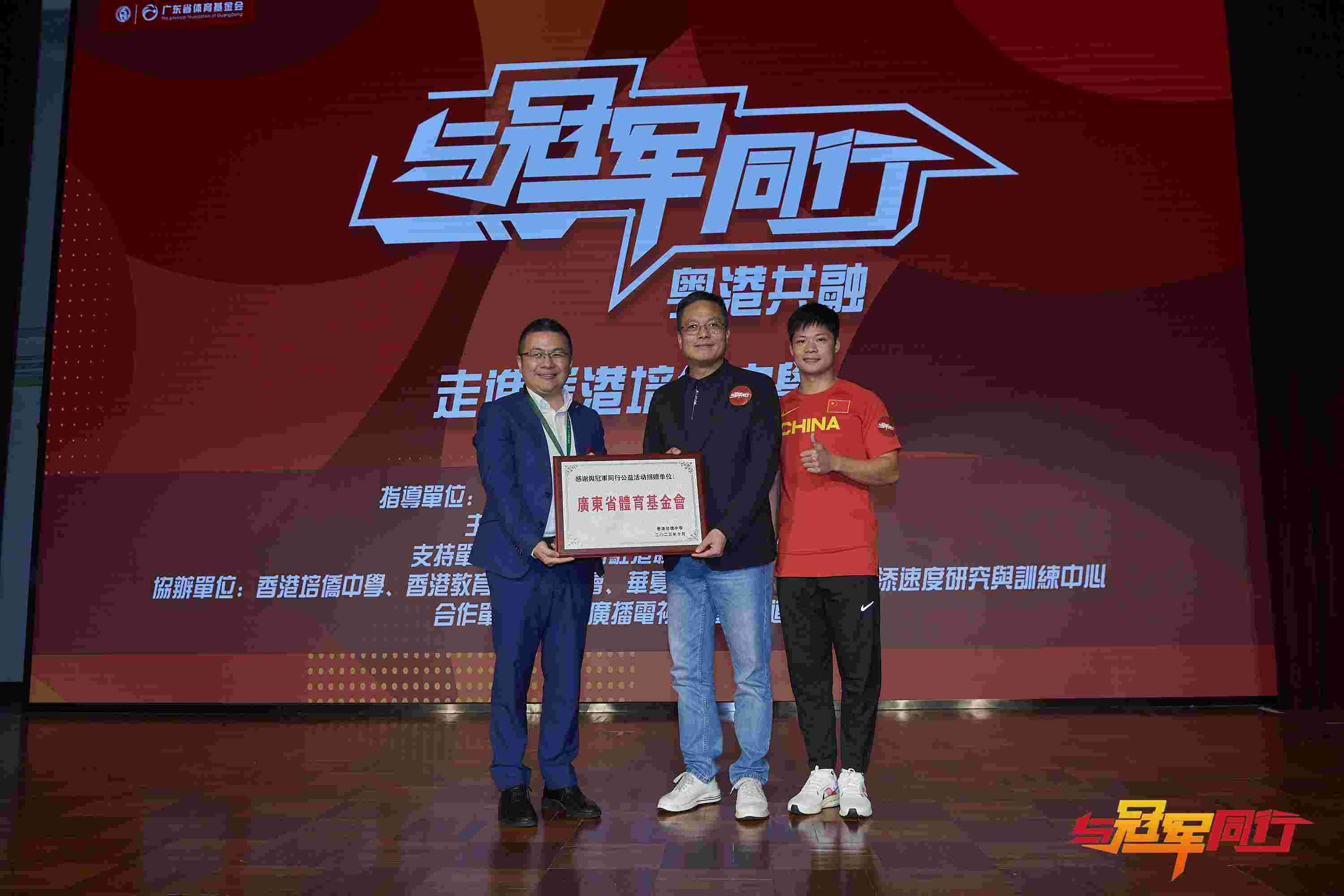 金秋十月,丹桂飘香,汇聚体育力量,连接粤港情谊。10月12日,由广东省体育基金会主办的“与冠军同行”公益活动在香港培侨中学隆重举行。其中活动指导单位:广东省体育局、广州市归国华侨联合会,支持单位: 中央政府驻港联络办宣传文体部,协办单位:香港培侨中学、香港教育工作者联会、华夏证券有限公司、苏炳添速度研究与训练中心,合作单位:广东广播电视台体育频道。